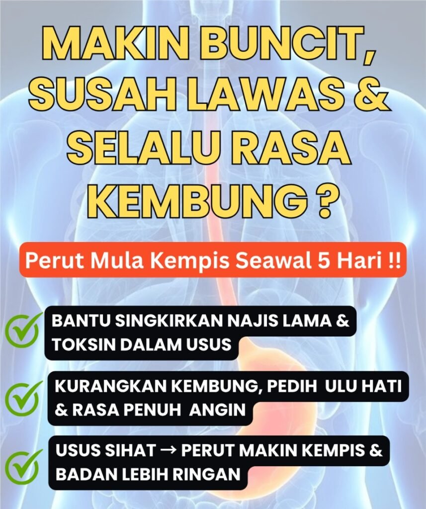 Bantu tenangkan saraf & sokong usus berfungsi lebih lancar. Bila usus stabil, sembelit berkurang & perut tak nampak boroi.